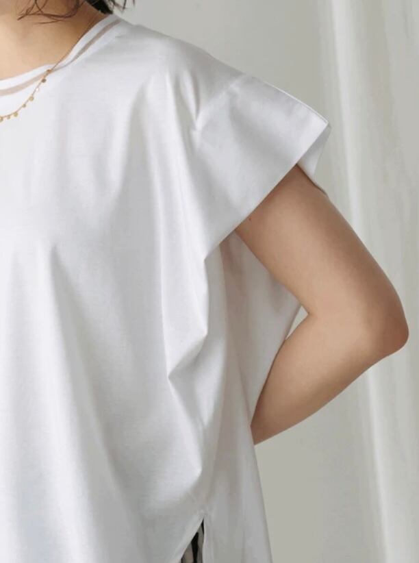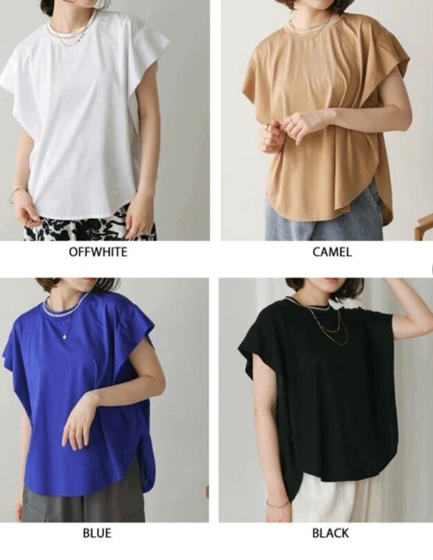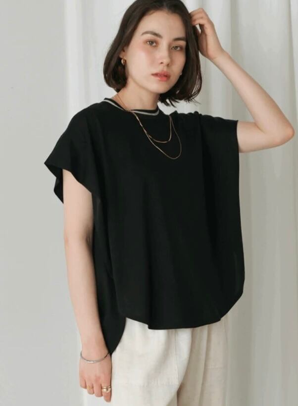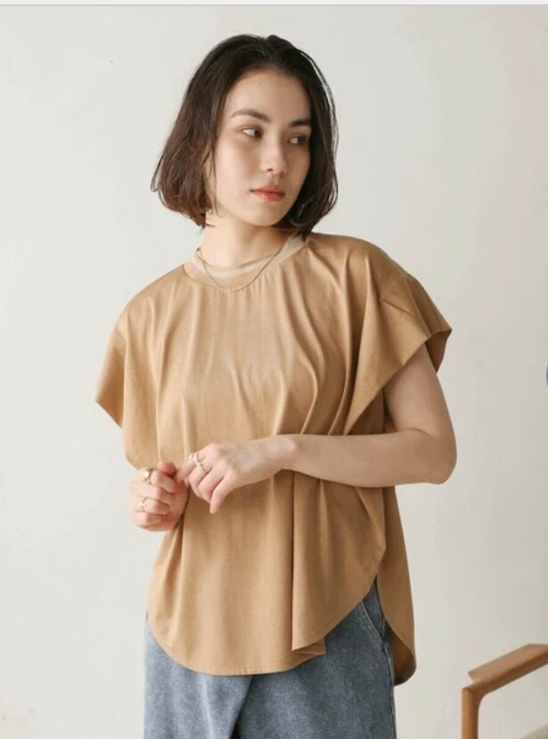 フレア袖が女性らしく、カジュアルになりがちなTシャツの増える夏に嬉しいブラウス見えカットソーです。