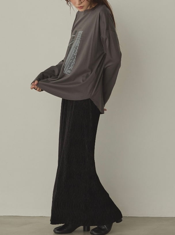 裾からレイヤードが見えやすい丈感です。ヒップも隠れる丈感で、リラクシーなサイズ感です。