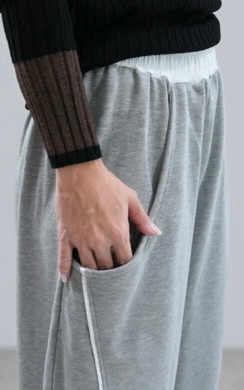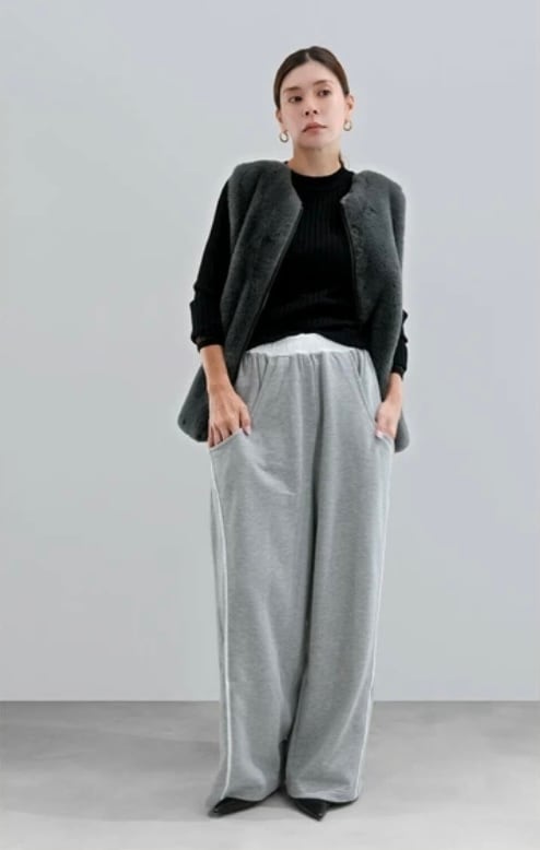 大きめにとったポケットと、ウエスト切り替えが特徴。