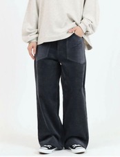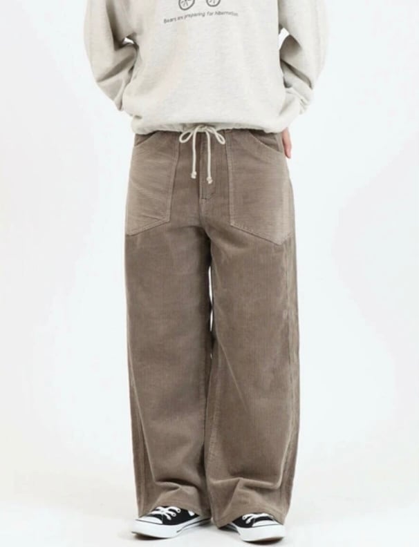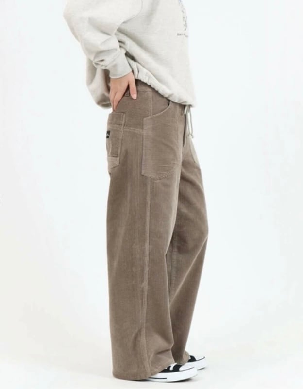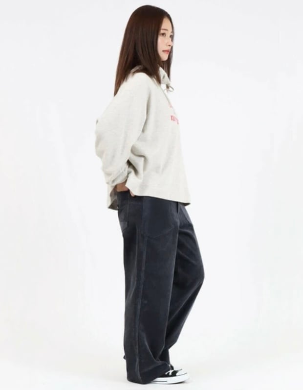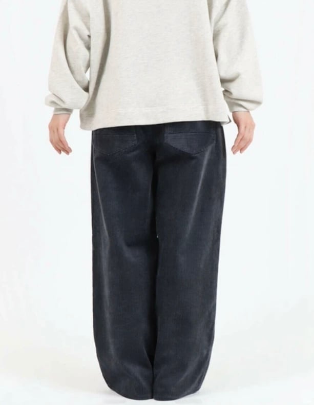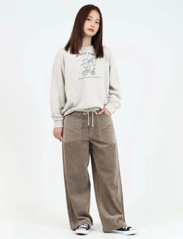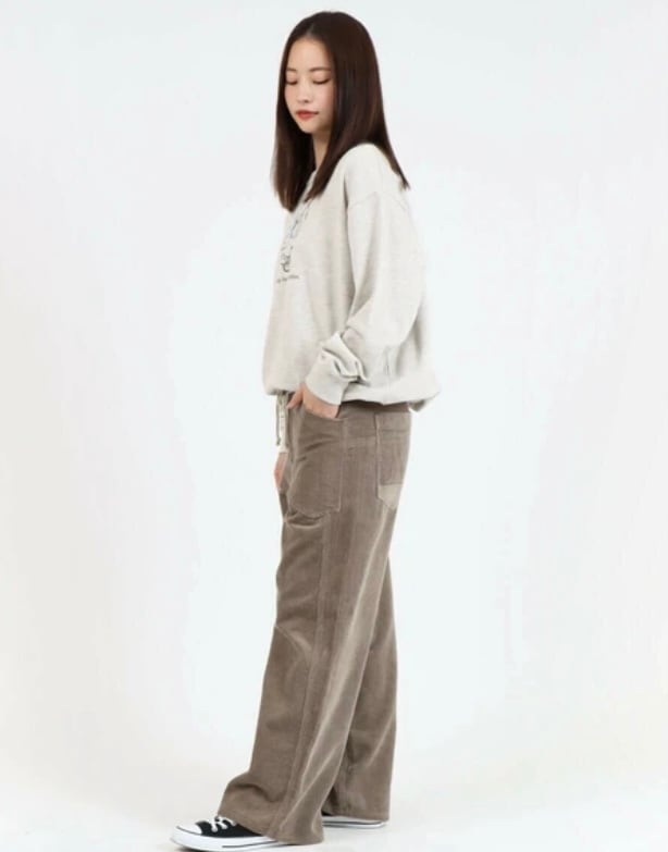 Cafettyの7Wコーデュロイは、綿100%の太畝が秋冬の暖かみあるカジュアルな印象を与えてくれる素材です。静電気が起こりにくく、程よい厚みと柔らかな風合いでごわつかず快適に着用いただけます。ワイドストレートシルエットは太すぎず細すぎず、女性の体型を美しく引き立てます。人気のベイカーパンツデザインを採用し、スクエア型の変形ポケットやヨーク、ポケットパーツで畝を横に配置、動きのある表情をプラスしました。後ろベルトのゴムでノンストレッチでもウエストの窮屈感なく穿いていただけます。コーデに馴染みやすいワーク系カラーの展開です。裏毛プルオーバーやデニムジャケット、スニーカーで秋冬のこなれたスタイルに。秋冬らしいあたたかみのあるコーデュロイ素材のベイカーパンツは、ワークテイストのデザインが程よく個性を演出。ナチュラルな雰囲気で、リラックス感のあるカジュアルコーデをおしゃれに格上げしてくれる一着です。