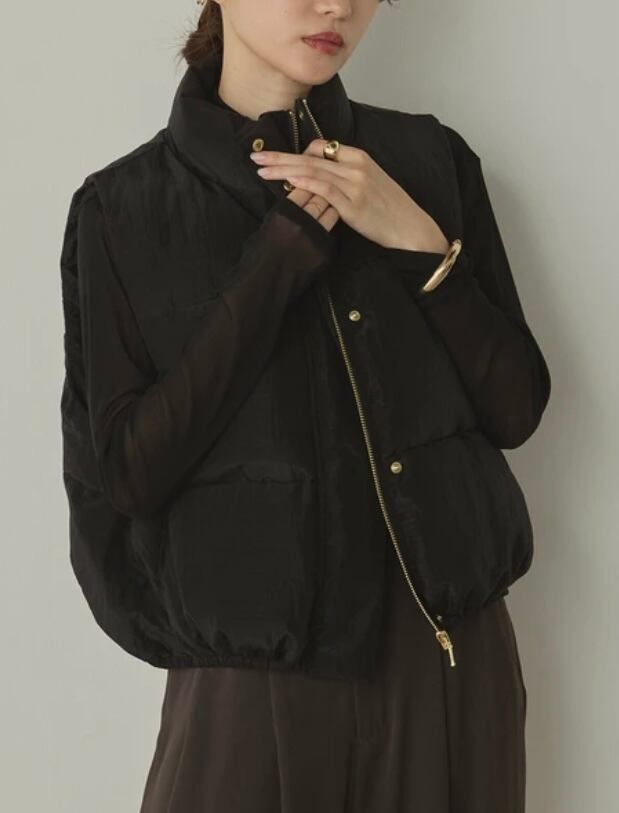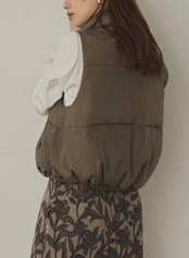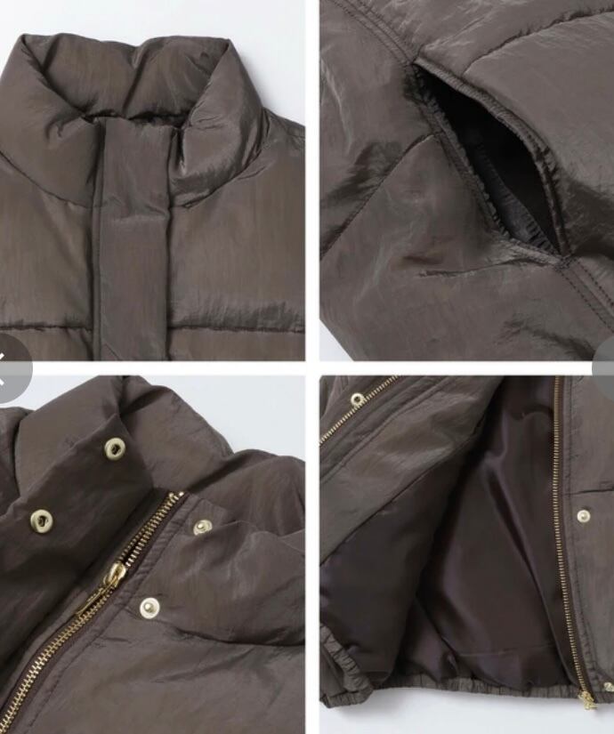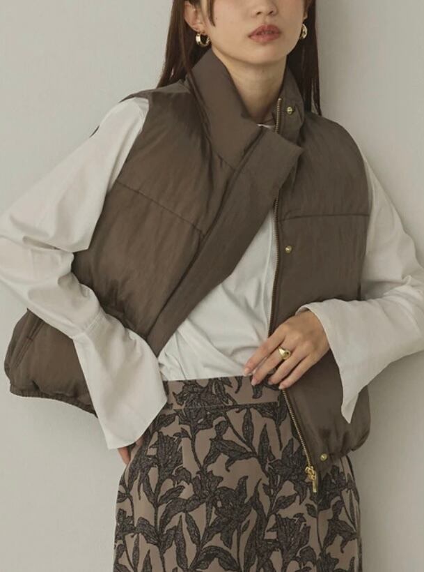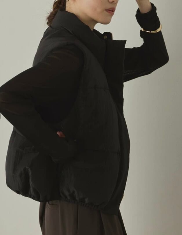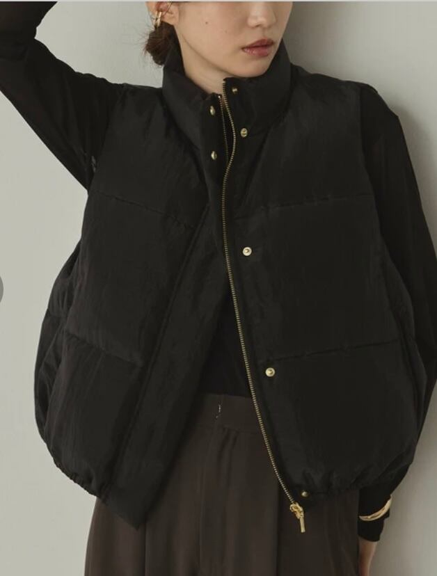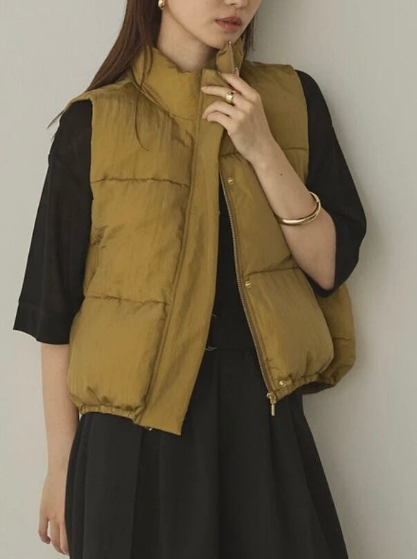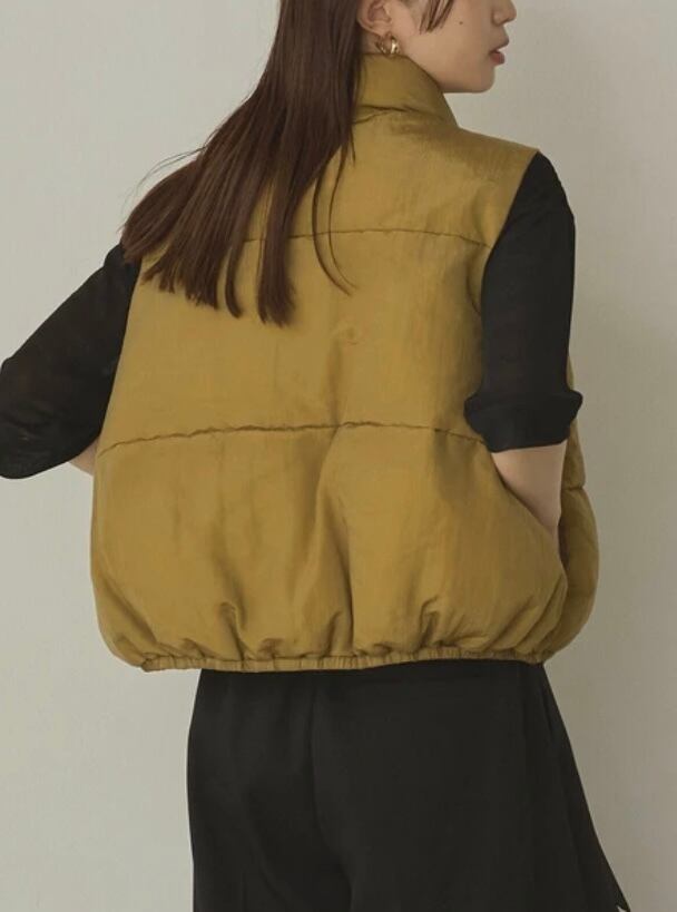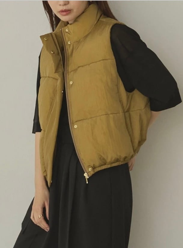 光沢のある、ナイロンの中綿ベストです。着丈は程よい短さです。