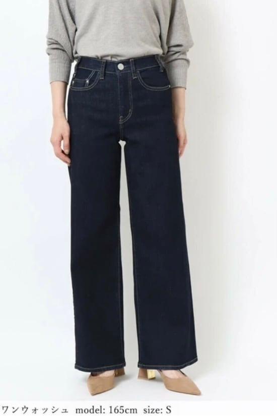 計算された織り組織と密度で、綿100%の様な表情を持つ定番素材【ストリィキングストレッチデニム】を使用。腰回りはスッキリと、裾に向かって程よく広がるワイドシルエット。ウエストにリブを使用し、トレンド感を見せながらラクチンな着用感を実現。デニムならではの加工感が楽しめる展開。ウエストベルトにつくメタルリングもアイキャッチに。