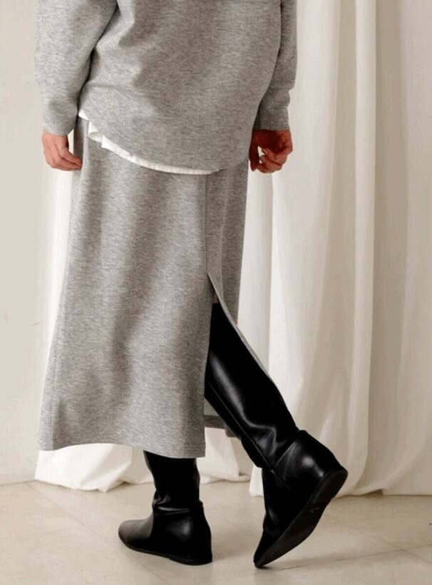スカートは程良いアイラインに深めに入ったバックスリットが何にでも合わせやすく、おなか回りはぐるりとゴムでストレッチ抜群の生地なのでストレスフリーでオシャレを楽しんでいただけます。